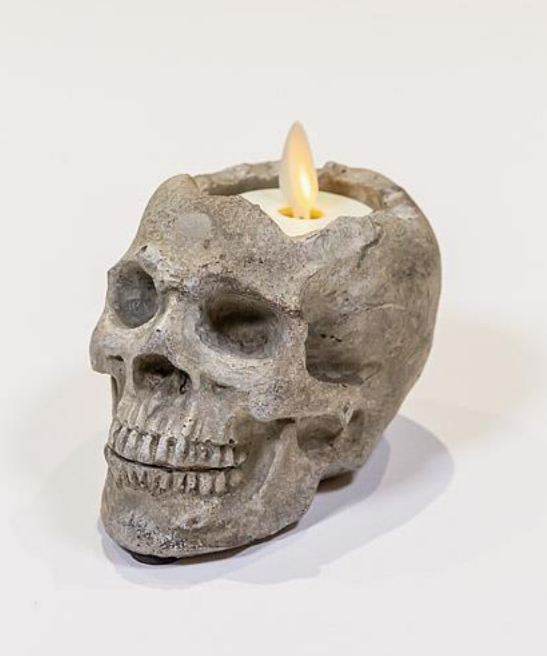 Add a delightfully spooky touch to your decor with this life-like Small Skull Planter/Tealite Holder. Crafted out of cement, this grey planter is sculpted with lots of rich texture and detail for a fun and frightful complement to the brightest of flowers, or a small tea lite.